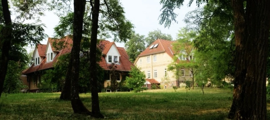 Hier hinterm Haus sitzen und lesen. Das Gemurmel der anderen Gäste hören. Über der Schafweide die Schwalben – knapp überm Boden. Zwitschern, Blätterrauschen. Ein Stück gehen, in die Bücherscheune gucken, zurückkehren, einen ganz großen Eisbecher mit Erdbeeren essen, weiter lesen. Zwischendurch ein Foto machen für die Postkarte aus Groß Breesen. Dann ein großer Raubvogel überm Haus. Leider erkenne ich sie immer noch nicht am Flugbild.
